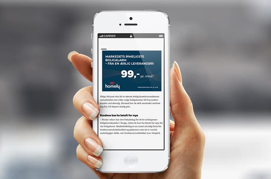 Kampanjeidéen ble raskt utarbeidet etter avsløringen av samarbeidet mellom boligalarm-selskapene Verisure og Sector Alarm. Homely er er en solid utfordrer til de store etablerte boligalarm-selskapene og ønsket synlighet på alle nyhetssaker som omhandlet konkurrentene. De aktuelle artiklene som ble publisert inneholdt relevante ord som “boligalarm” og “alarmselskap”. Ved hjelp av Kobler kunne vi enkelt distribuere bannerannonsene til Homely i artikler som inneholdt disse viktige begrepene. Det enkle og tydelige budskapet til Homely oppnådde høy synlighet i kontekst, og med følgende budskap til målgruppen: