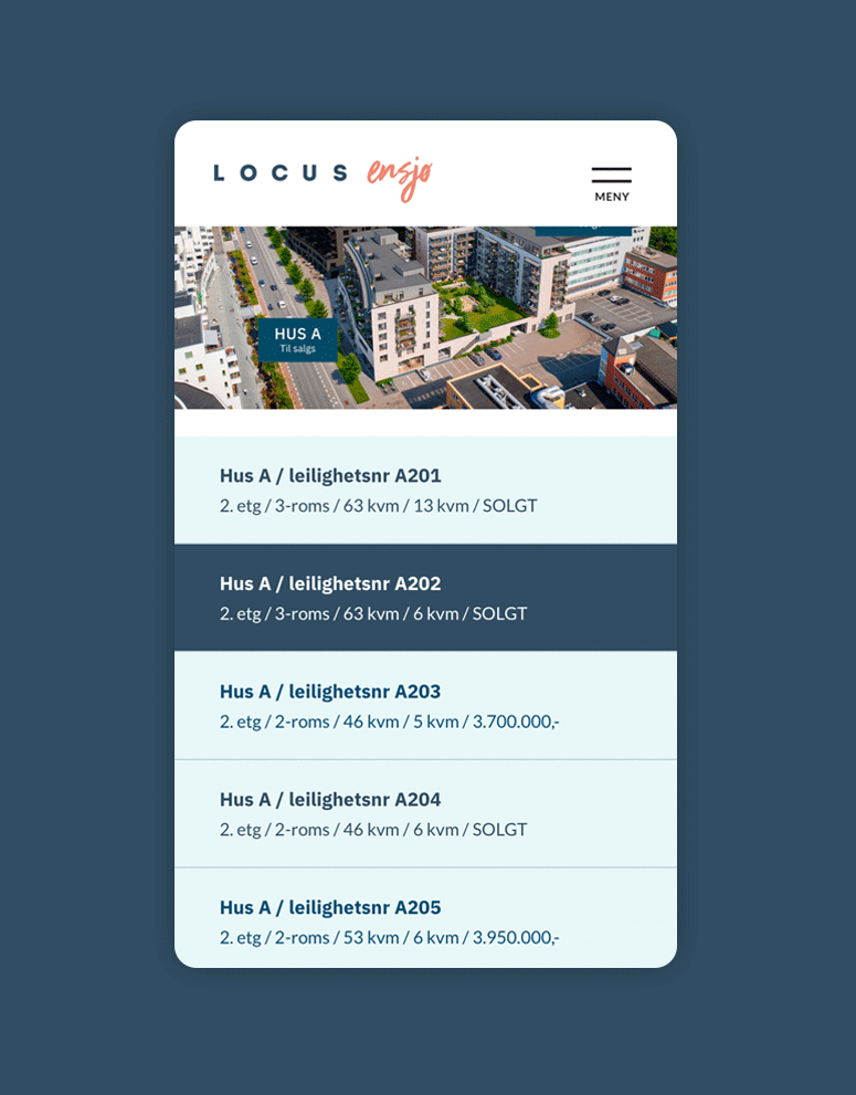 Det har vært stor interesse rundt Locus Ensjø sin lansering av leiligheter. Prosjektet har en god miks av store 2-, 3- og 4-romsleiligheter med høy standard og flotte uteplasser og balkonger til alle leiligheter. Salgsstart trinn 1, var høsten 2019. 4 og siste trinn ble lansert våren 2021. Resultat: 206 leiligheter solgt og utsolgt høsten 2021.
