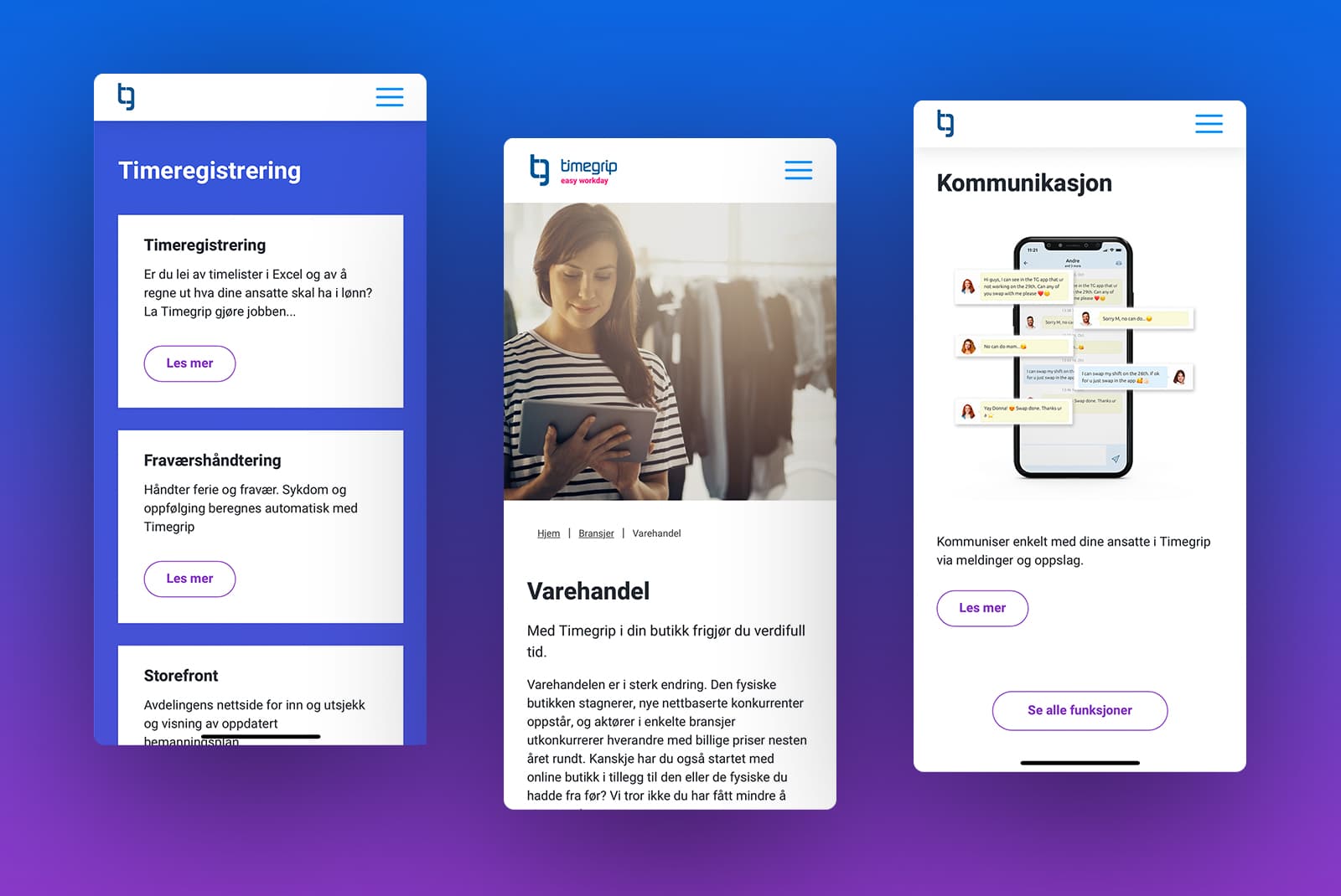 Timegrip kontaktet oss for å fremheve bredden i sitt tjenesteaspekt og tydeliggjøre sin visuelle identitet. Vi har utviklet visuell profil og nye nettsider med fokus på gode presentasjoner av hvilke utfordringer de kan løse for sine kunder. Med de nye nettsidene er det tydelig hvordan Timegrip er med på å gjøre arbeidsdagen for sine kunder enklere innenfor bemanningsplanlegging, timeregistrering og lønnskjøring.