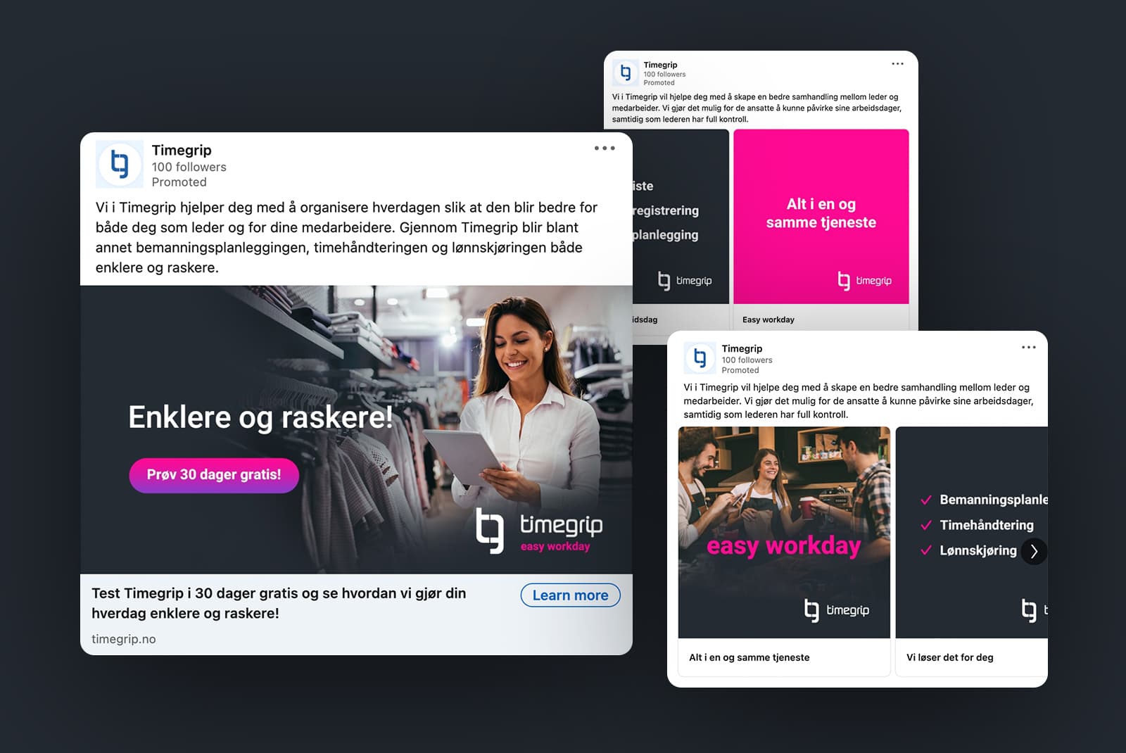 Annonseringen har gitt resultater, og allerede etter noen måneder med annonsering hadde trafikken inn til nettsiden mer enn doblet seg. I et always-on løp er det også viktig med en god strategi og kommunikasjon mellom kunden og oss. Vi startet annonseringen med to budskap i alle kanaler, ett med fokus på branding og ett med fokus på CTA. Underveis i løpet analyserte vi resultater og hadde løpende kommunikasjon med Timegrip for å justere budskap og bygge videre på de gode resultatene.